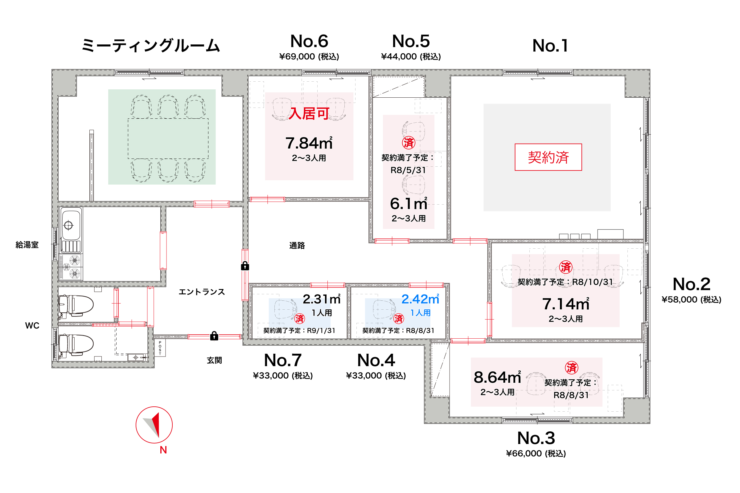 | No.6 | 入居可 | ¥69,000 | 7.84㎡ | 2〜3人 |